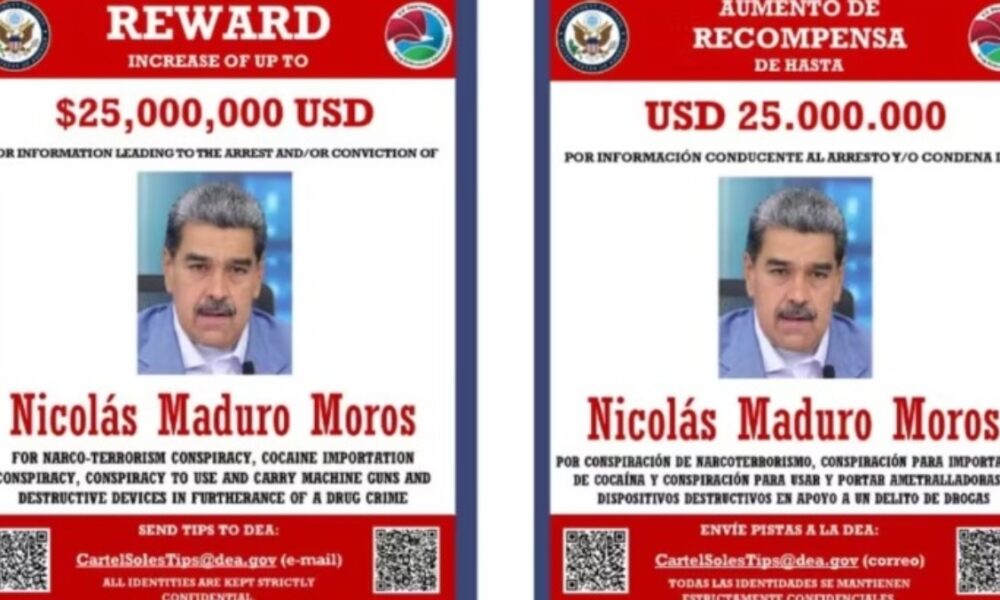 A informação foi divulgada por meio de um cartaz com a foto de Maduro e o valor da recompensa O Departamento de Justiça dos Estados Unidos...